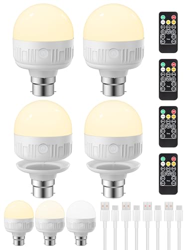 LGMCF Rechargeable Light Bulb, B22 Dimmable Light Bulb with Magnetic Base Detachable, 3 Color 8W Portable Battery Operated Bulbs with Remote Control & Timer for Non Hardwired Lamps, Emergency, 4 Pack