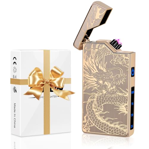 Gifts for Him Men, Electronic Lighter Arc Plasma Lighter with Battery Indicator, USB C Rechargeable Lighter Windproof Portable Pocket Camping Lighters (Gold Dragon)