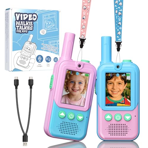 Video Walkie Talkies for Kids 2 Pack, Rechargeable Kids Walkie Talkies with Screen Display&4 Funny Voice Changer for 3-12 Year Old Girls Boys,Outdoor Toys for Adventure Game Hiking Camping(Blue Pink)