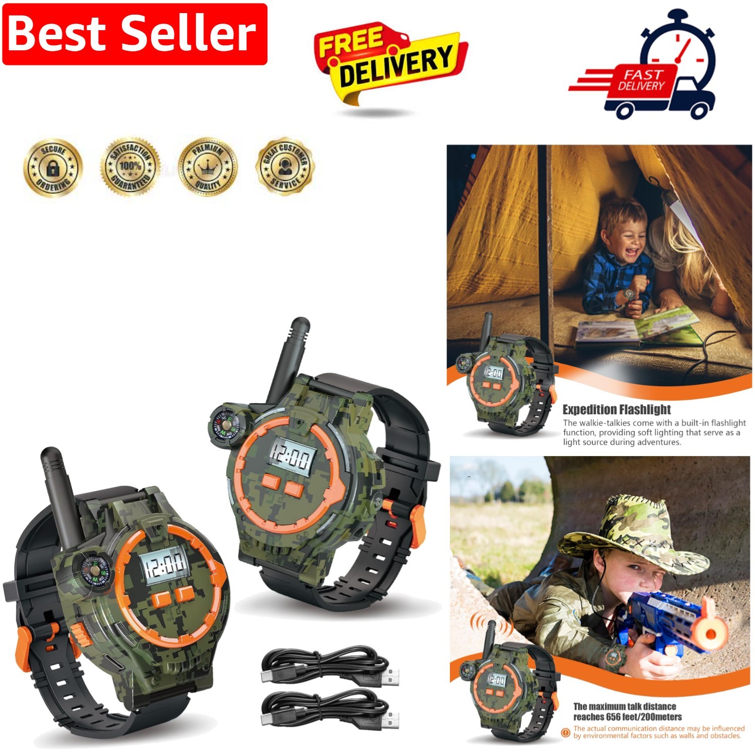 Rechargeable Walkie Talkies for Kids 2PCS,2Way Radio Flashlight, Compass 200M