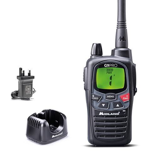 Midland - Walkie Talkie G9 PRO with UK Plug, IPX4 Waterproof Long Range Walkie Talkies, Airsoft & Outdoor, 2 Way Radio 105 Channels - 36 PMR446/69 LPD, 12Km Range, 23H Battery, Rechargeable Batteries