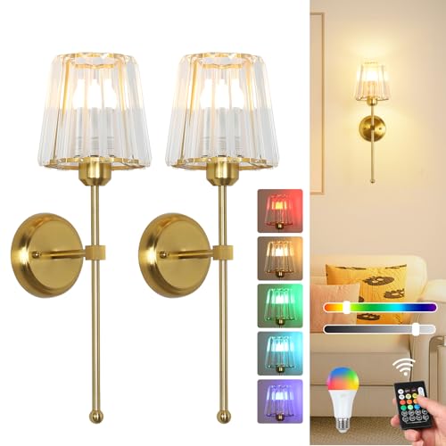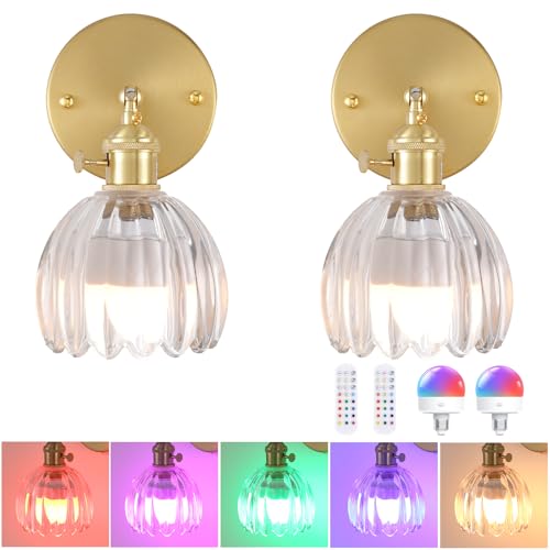 Stepeak Battery Operated Wall Lights Set of 2, Rechargeable Wall Lights Indoor with USB RGB Bulb & Remote, Gold Glass Wireless Wall Light Sconce, Battery Operated Wall Lamp for Bedroom Living Room