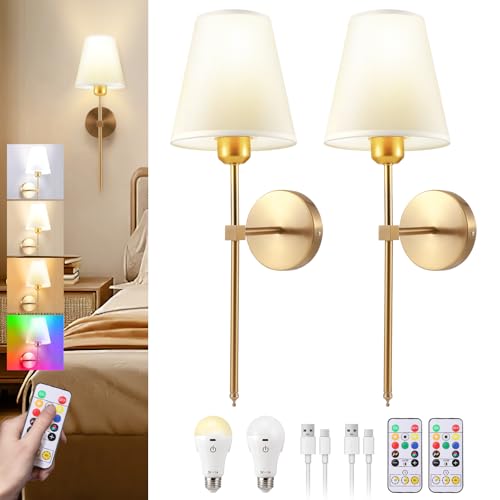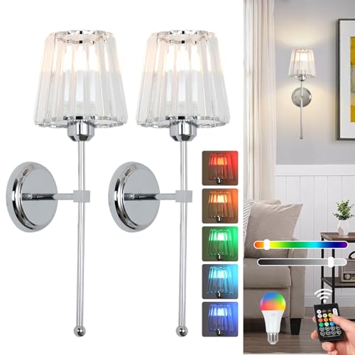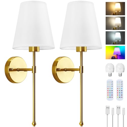 Battery Operated Wall Sconces Set of 2, Rechargeable Wall Lights with 6 Colors RGB Dimmable Detachable LED Bulbs and Remote, Wireless Wall Lamp for Bedroom Living Room Hallway Decor, Not Hardwired