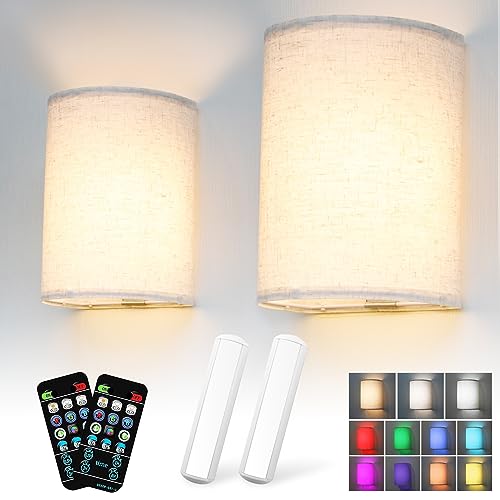 Battery Operated Wall Lights 2 Pack, RGB Colors Changeable Dimmable Height Fabric Sconces, Wireless Wall Sconces with Remote, 2500mAh Rechargeable Wall Lamp for Bedroom Living Room Hallway