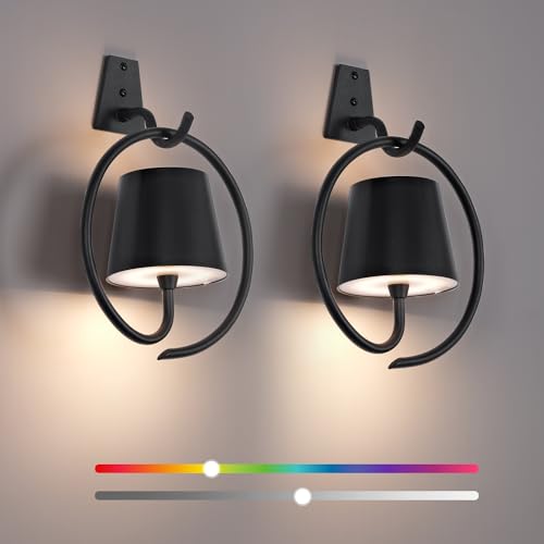 Battery Operated Wall Lights, 2 Pack RGB Rechargeable Wall Light Indoor Cordless Wall Lamp, Dimmable Wireless LED Wall Lamps IP54 Waterproof Wall Sconce Lights for Bedroom, Living Room(Black)