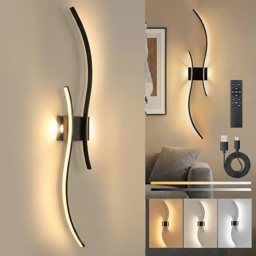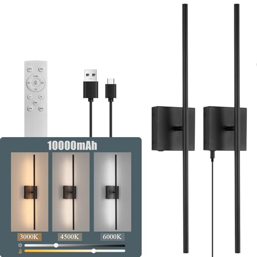 Dehobo Rechargeable Wall Sconce Lights, Battery Operated Wall Lights 3 Color Temperature, Wall Lamp Dimmable Wireless with Remote Control Black 60CM for Living Room Bedroom Hallway, 2 Pack