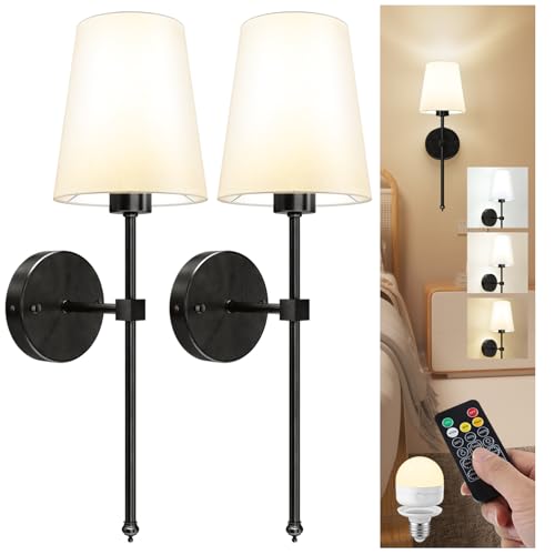 LGMCF Battery Operated Wall Sconce Set of 2, Rechargeable Wall Lights with 5000mAh Detachable Charging Bulbs and Remote, 3 Color Dimmable Wireless Sconces for Bedroom Living Room Hallway, Black