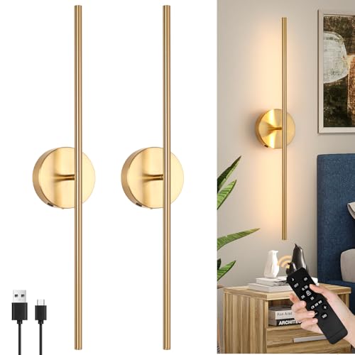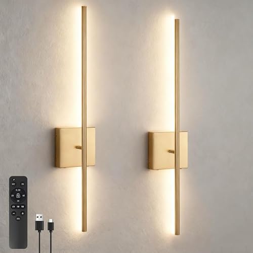 EIDEARAY Battery Operated Wall Lights Indoor, USB Rechargeable LED Wall Lamp with Remote Control, Dimmable Wall Light Wireless, Gold 70CM Modern Wall Sconce for Living Room Bedroom(2 Pack)