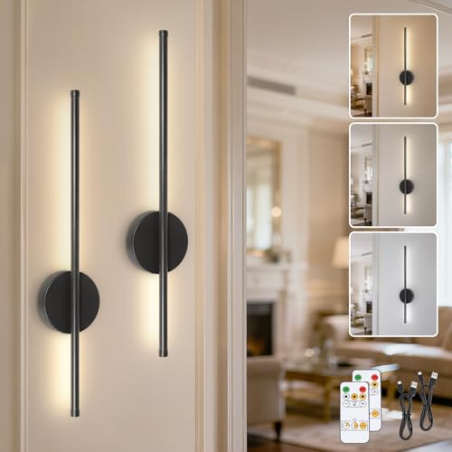TaoFiaCo Black Rechargeable Wall Lights with Remote Control - 60CM Modern Battery Operated Wall Lights Indoor for Living Room Bedroom - 3 Color Temperatures Wireless Wall Sconces 2 Pack
