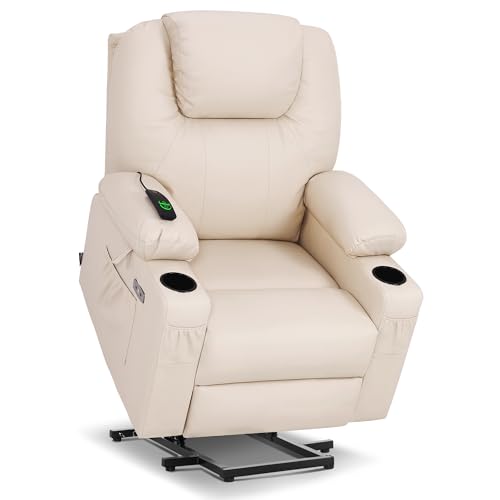 MCombo Riser and Recliner Chairs for Elderly, Electric Power Lift Chairs for Living Room, Cream Lift Armchair with Heat & Massage, Extended Footrest, USB Ports, Faux Leather 7040 (Cream White, Medium)