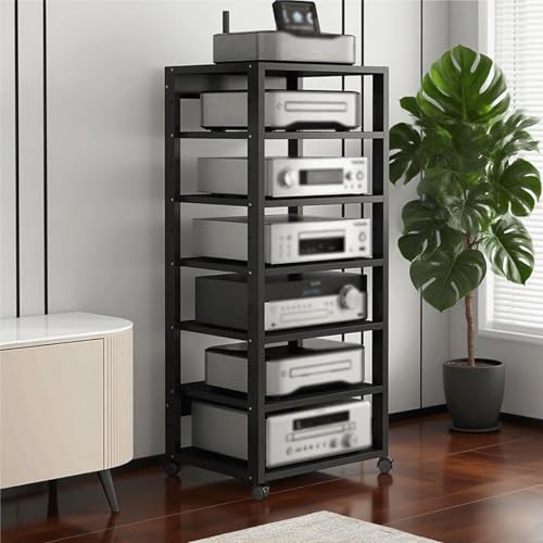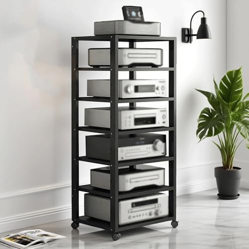 7 Tier Audio Rack Tower, Movable Record Player DVD Cd Audio Rack Tower Holder, with Adjustable Wooden Suitable Weight Capacity 550 Lbs, for Home and Office(Black)