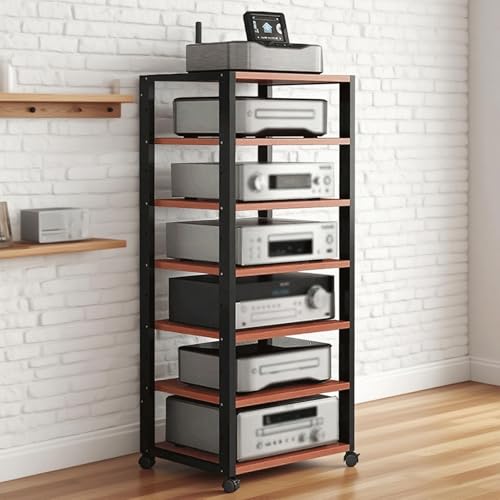 7 - Tier AV Media Stand, Record Player DVD CD Audio Rack Tower Holder, with Wheels and Adjustable Wooden Shelf Easy to assemble for Home Office Theater(Red)