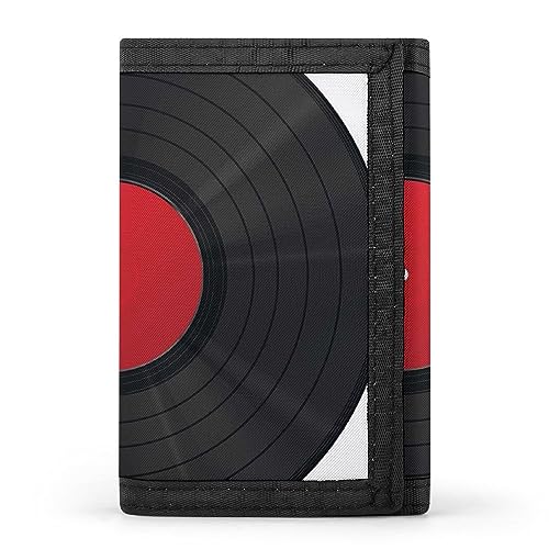 Realistic Vinyl Record CD Player Texture Black Red Pattern Trifold Wallet, Stylish Purse with Keychain, Credit Pass Case Card-Holder for Crash Bills Receipts Women Men 5 x 3.3 x 0.2 Inch