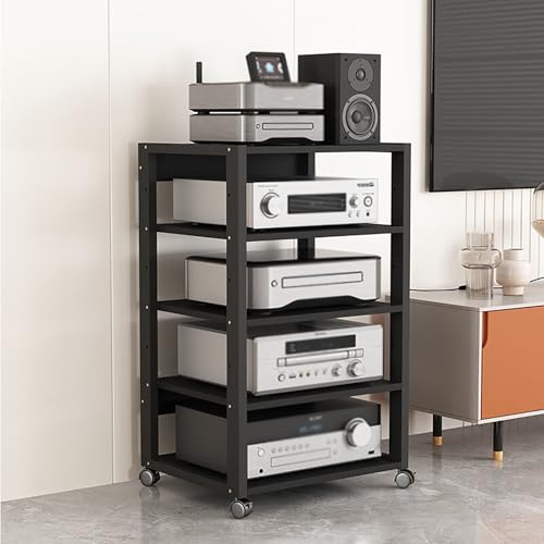 Dernoing 5 Tier Audio Rack Tower, CD Record Player Stereo Receiver AV Equipment Cabinet Display Rack, Weight Capacity 220 lbs, with Adjustable Wooden Shelves for Home (Black-2, 5tier)