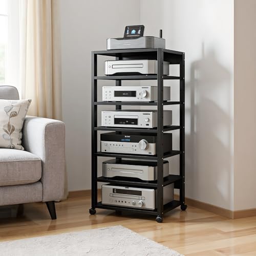 HiFi Rack AV Shelf 7 Tier Audio Rack Tower, Movable Record Player CD Audio Rack Tower Holder With Wheels, Suitable for Home and Office(Black)