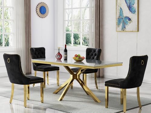 Luxury Dining Table Set for 4, 70" White Marble Dining Room Table and 4 Black Velvet Chairs, 5-Piece Modern Rectangle Kitchen Table Set with Gold X-Stainless Steel Legs for Kitchen, Dining Room