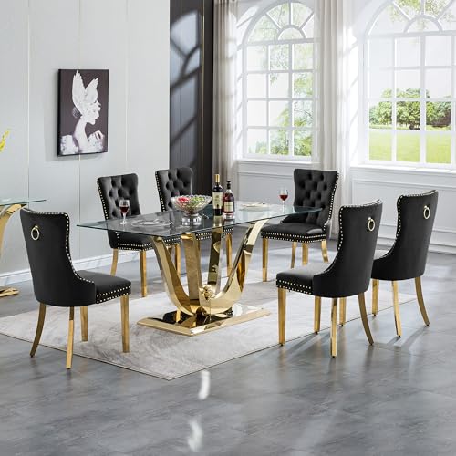 Luxury Dining Table Set for 6, 70" Tempered Glass Dining Room Table and 6 Black Velvet Chairs, 7-Piece Modern Rectangle Kitchen Table Set with Gold Stainless Steel Pedestal for Kitchen, Dining Room