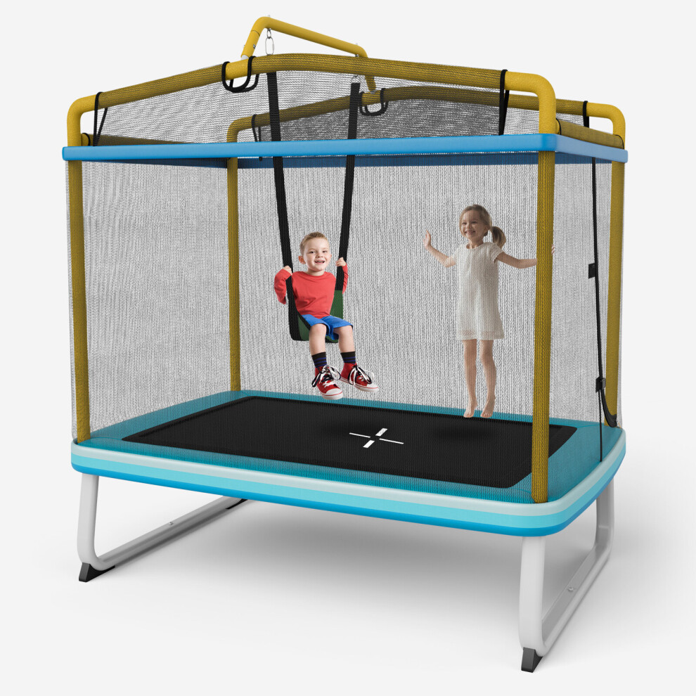 COSTWAY 3 in 1 Kids Trampoline, 6FT Mini Toddler Trampolines with Swing, Horizontal Bar and Enclosure Safety Net, Rectangle Trampoline for Outdoor Indoor (Blue + Yellow)