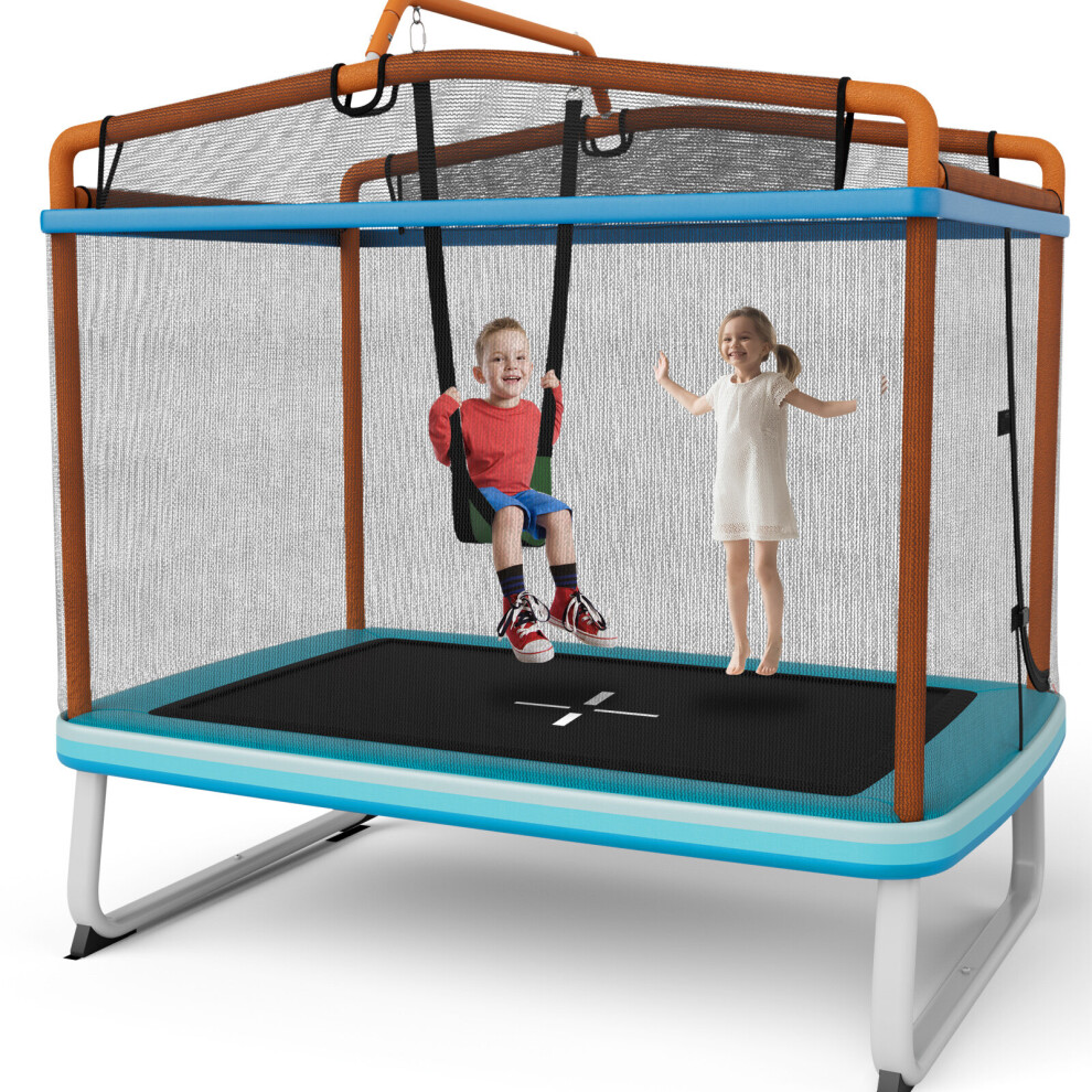GYMAX 6 FT Kids Trampoline, Rectangle Trampoline with Enclosure Net, Swing and Spring Cover, Indoor Outdoor Combo Bounce Trampoline for Boys & Girls (Blue)