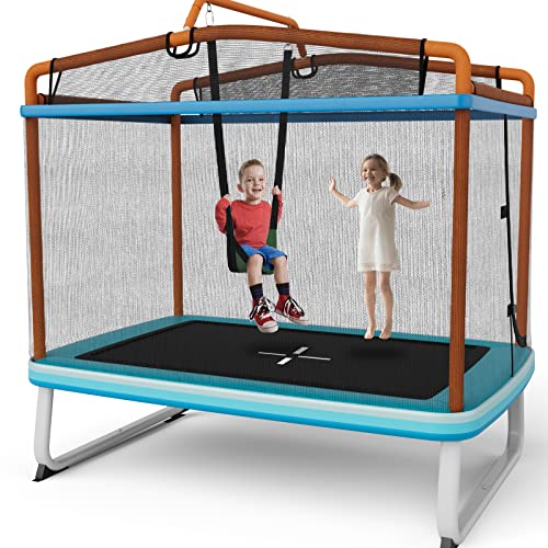 6FT Kids Trampoline with Swing, Rectangle Recreational Trampoline with Enclosure Safety Net, Indoor Outdoor Baby Toddler Play Combo Bounce, Birthday Gift for Boy & Girl (Blue)
