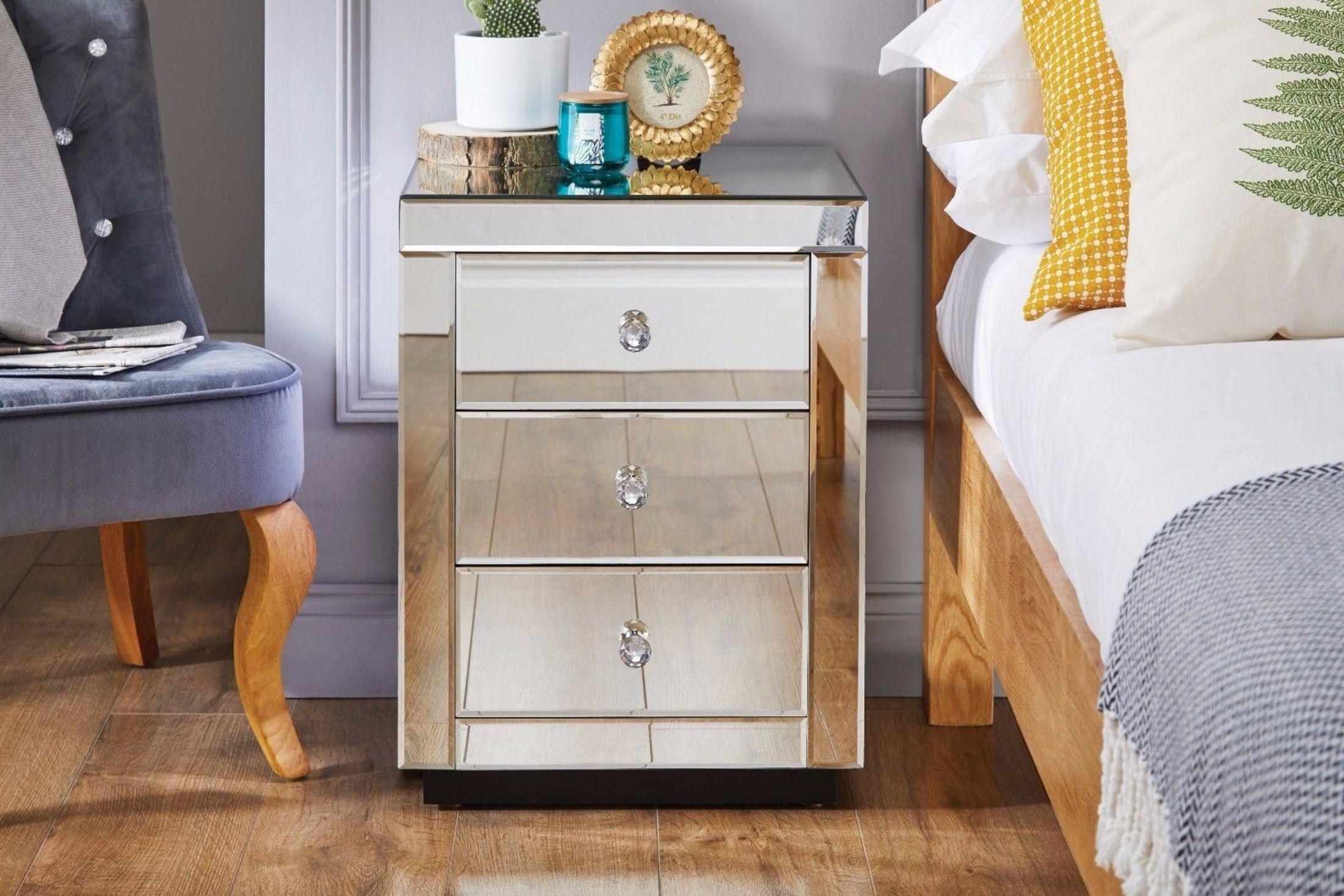 Italian Inspired Contemporary Mirrored 3 Drawer Rectangular Bedside Table with Crystaline Shaped Handles