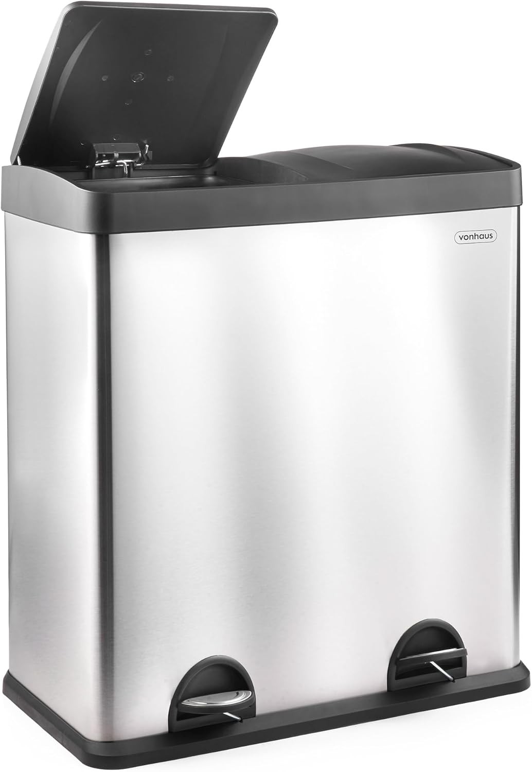 VonHaus Kitchen Bin, 60L Double Recycling Bin for Kitchen, Stainless Steel Two Section Food Waste Separation System with Non-Slip Base & Removable Inner-Compartments, Large Airtight Trash Can, 2 x 30L