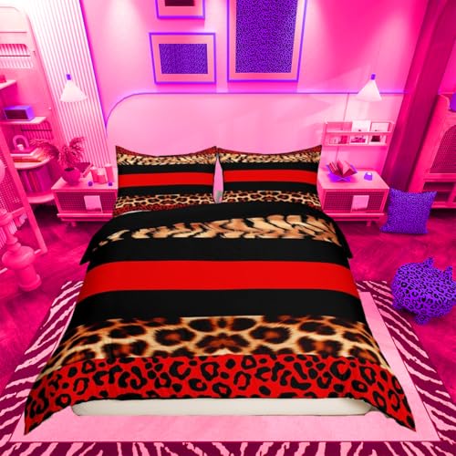 Loussiesd Leopard Comforter Cover Boys Girls Print Red Black Bedding Set For Kids Ultra Soft Safari Duvet Cover Animal Bedspread Cover Bedclothes Zipper Double