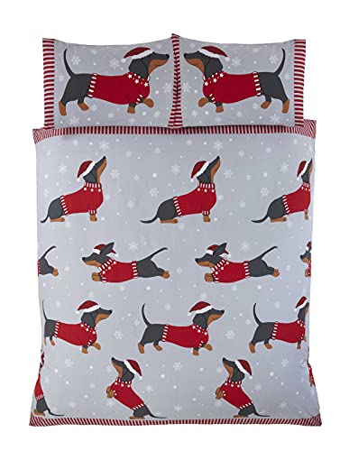 Rapport Home Dachshund Through The Snow Single Duvet Cover Set - Festive Red Christmas Bedding with Sausage Dog Print, 2 Piece