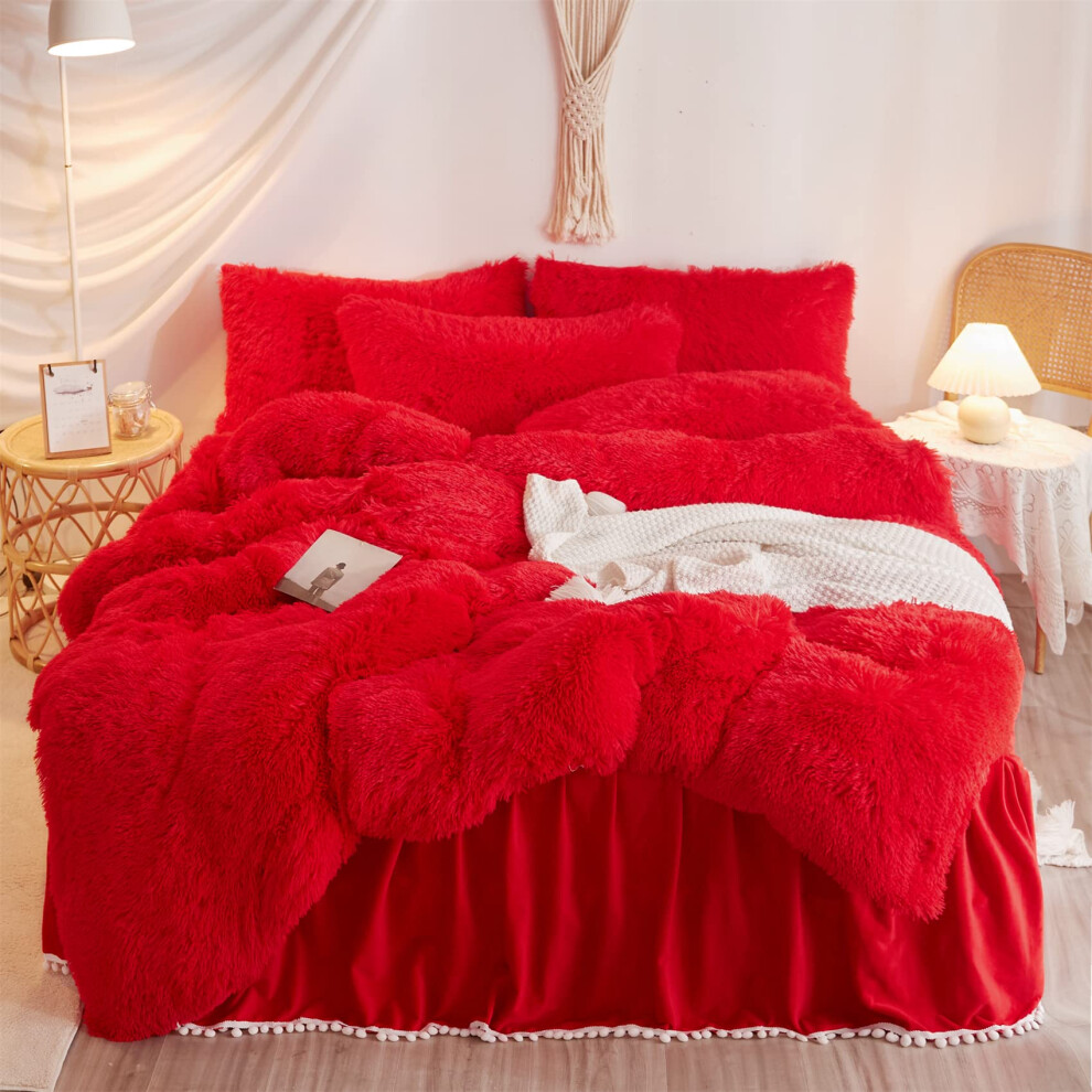 HAIHUA Fluffy Red Comforter Cover Set Queen Faux Fur Red Bedding 3 Pieces1 Plush Queen Duvet Cover +2 Faux Fur Pillowcases Faux Fur beddys Red Queen