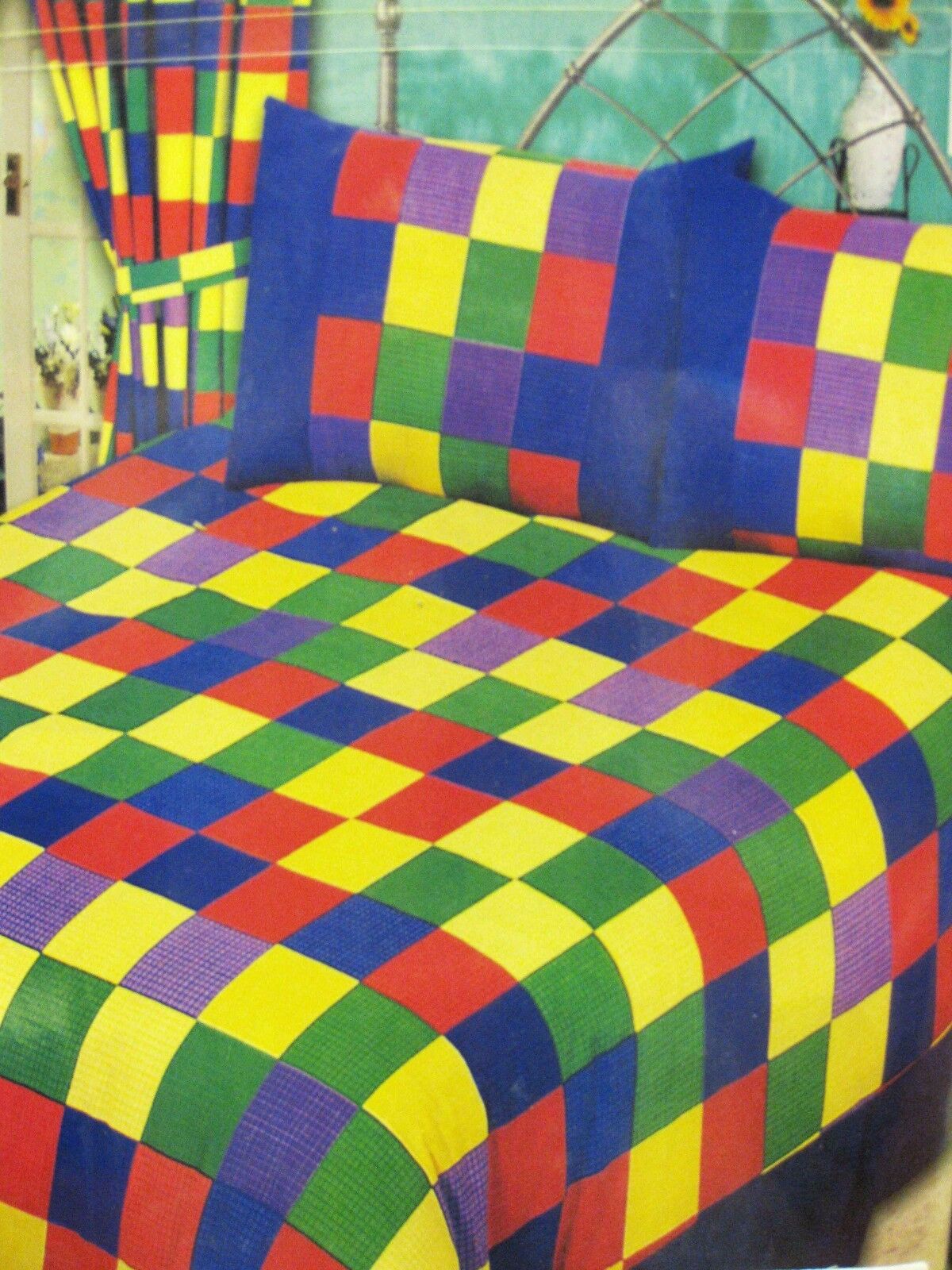 KING SIZE DUVET COMPLETE SET MULTI SQUARE CHECK BLUE GREEN YELLOW RED BEDDING