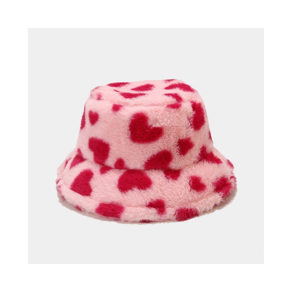 (Red) Bucket Fuzzy Warm Hat With Heart Illustration For Winter Outings Streetwear And
