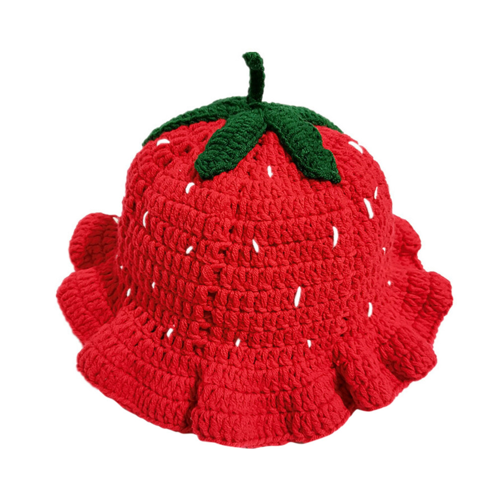 (M, Red) Crochet Bucket Hat for Women Cute Strawberry Knit Fisherman Cap Breathable Warm Hat