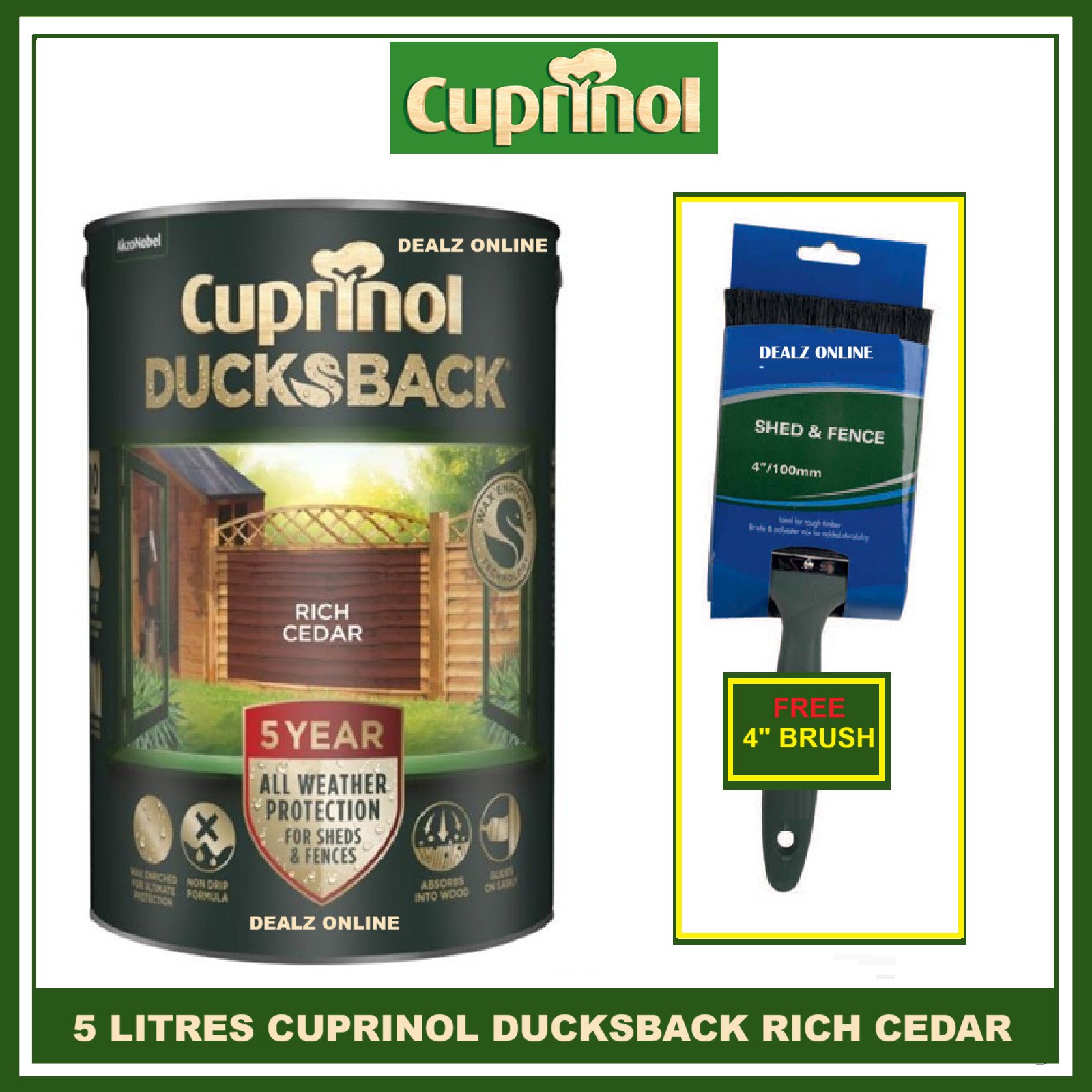 Cuprinol 5 Year Ducksback RICH CEDAR 5L + 4" FENCE BRUSH