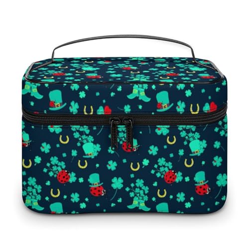Travel Make Up Bag for Men Womens Shamrocks Green Clover Red Ladybug Cosmetic Bags with Compartments Handle Wedding Party Large Capacity Waterproof Skincare Toiletry Makeup Box Organizer