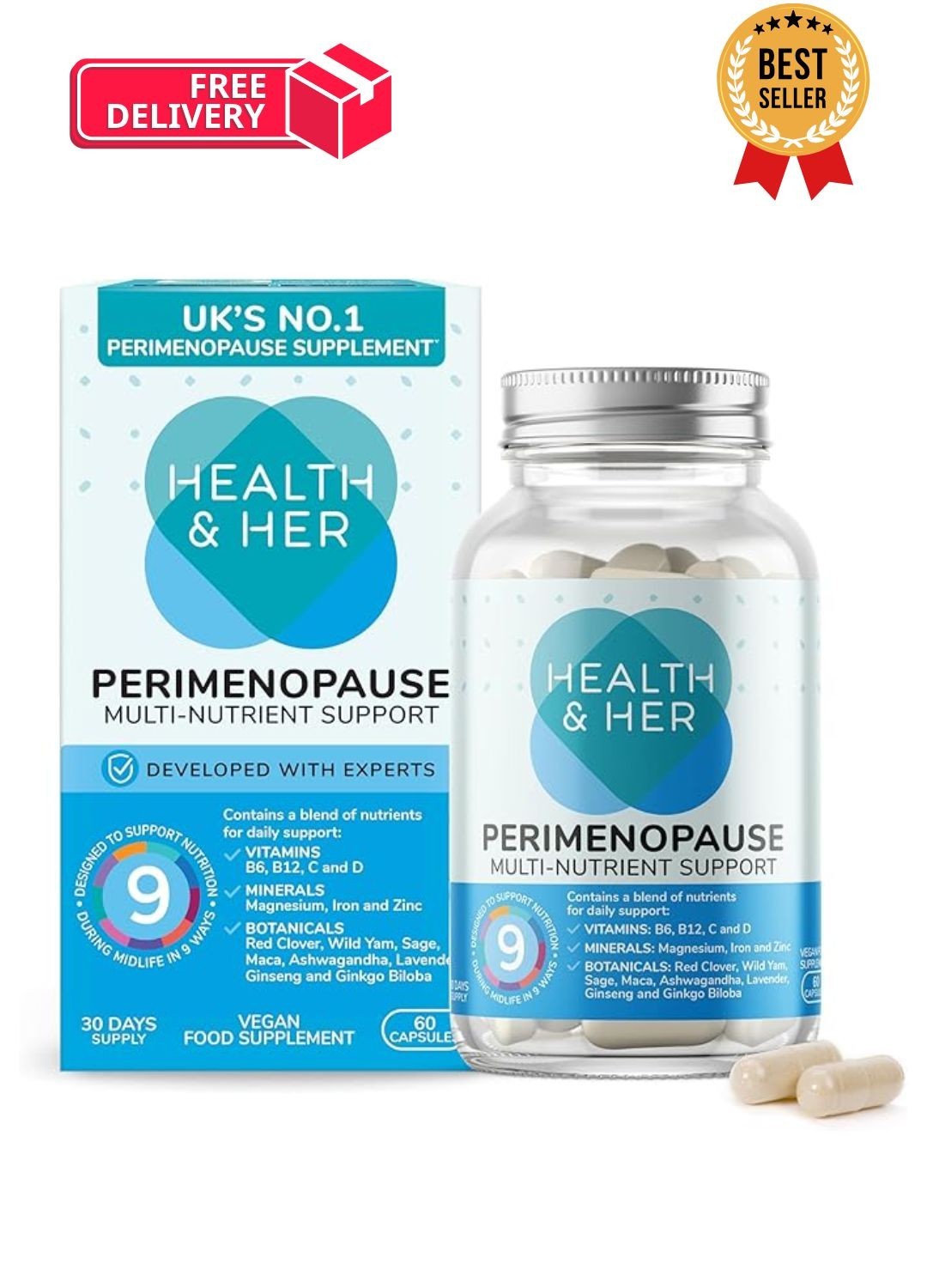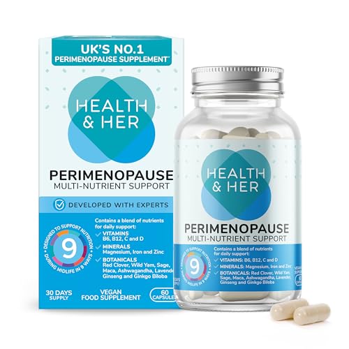 Health & Her Perimenopause Supplements for Women - with Red Clover, Wild Yam Ashwagandha. Wellbeing Support for The Early Stage of Menopause - 1 Month Supply, 60 Capsules - Vegan & Gluten Free