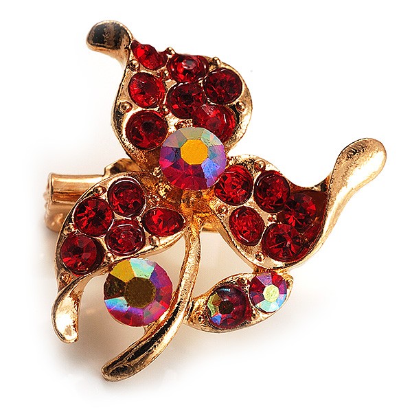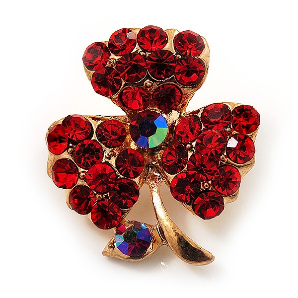 Tiny Red Crystal Clover Pin Brooch (Gold Tone)