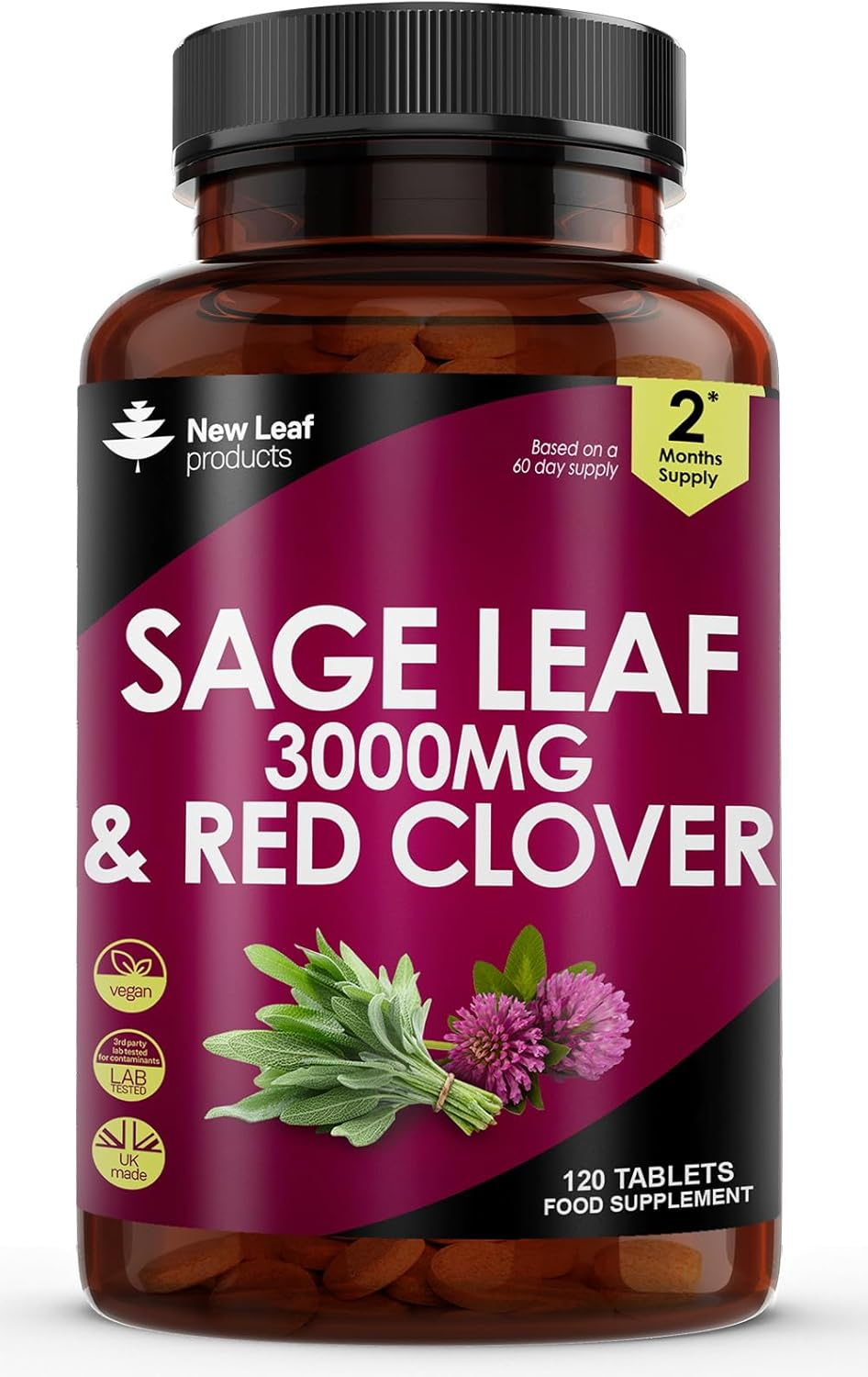 Sage Leaf & Red Clover Tablets for Menopause - 3000mg High Strength Perimenopause Supplements with Sage Leaf and Red Clover Menopause Supplements - Vegan Sage 120 Tablets Made in UK by New Leaf