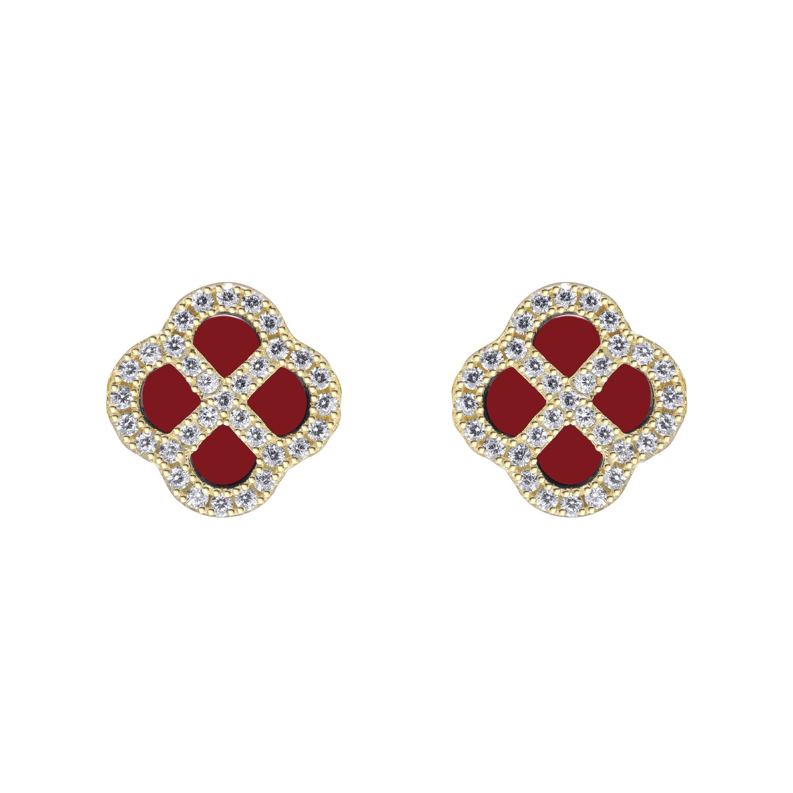 Gold-plated Silver Jewelco London CZ Red Agate Clover Kiss Stud Earrings 11mm