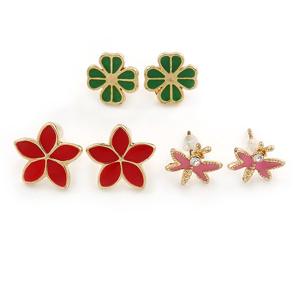 Children's/ Teen's / Kid's Pink Dragonfly, Red Daisy, Green Clover Stud Earring