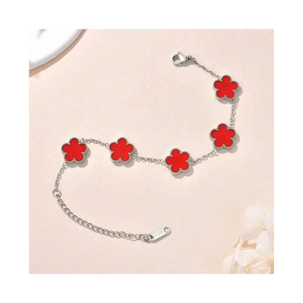 (Red-Silver) Lucky Clover Women's Hand Bracelets Double Sided Flowers Jewellery Gifts Stainless Steel Bracelet Gold Plated Bracelets Man