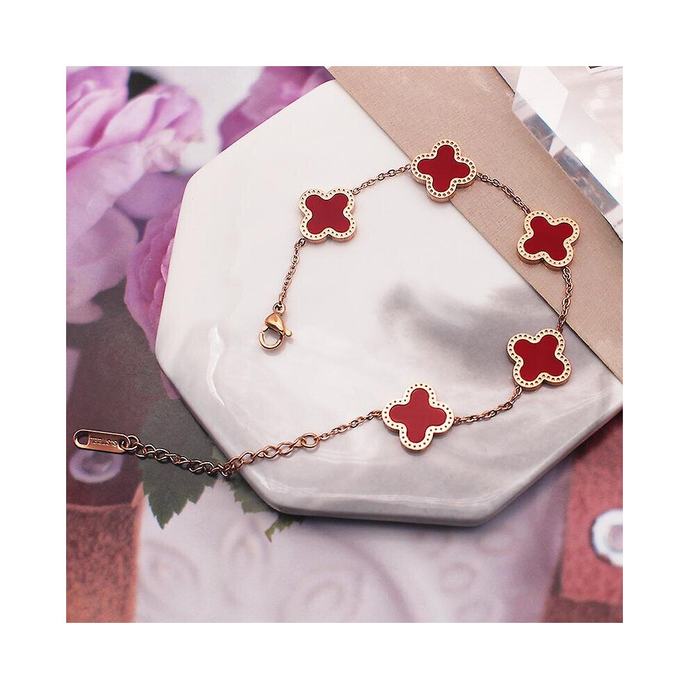 (Red-Gold) Lucky Clover Women's Hand Bracelets Double Sided Flowers Jewellery Gifts Stainless Steel Bracelet Gold Plated Bracelets Man