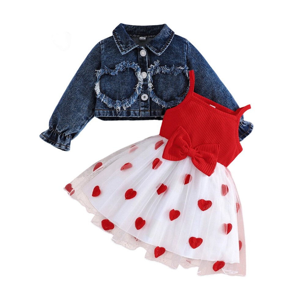 (9-12 Months, Red) Toddler Girl Fall Outfits Heart Print Tulle Patchwork Cami Dress with Long Sleeve Lapel Button Denim Jacket