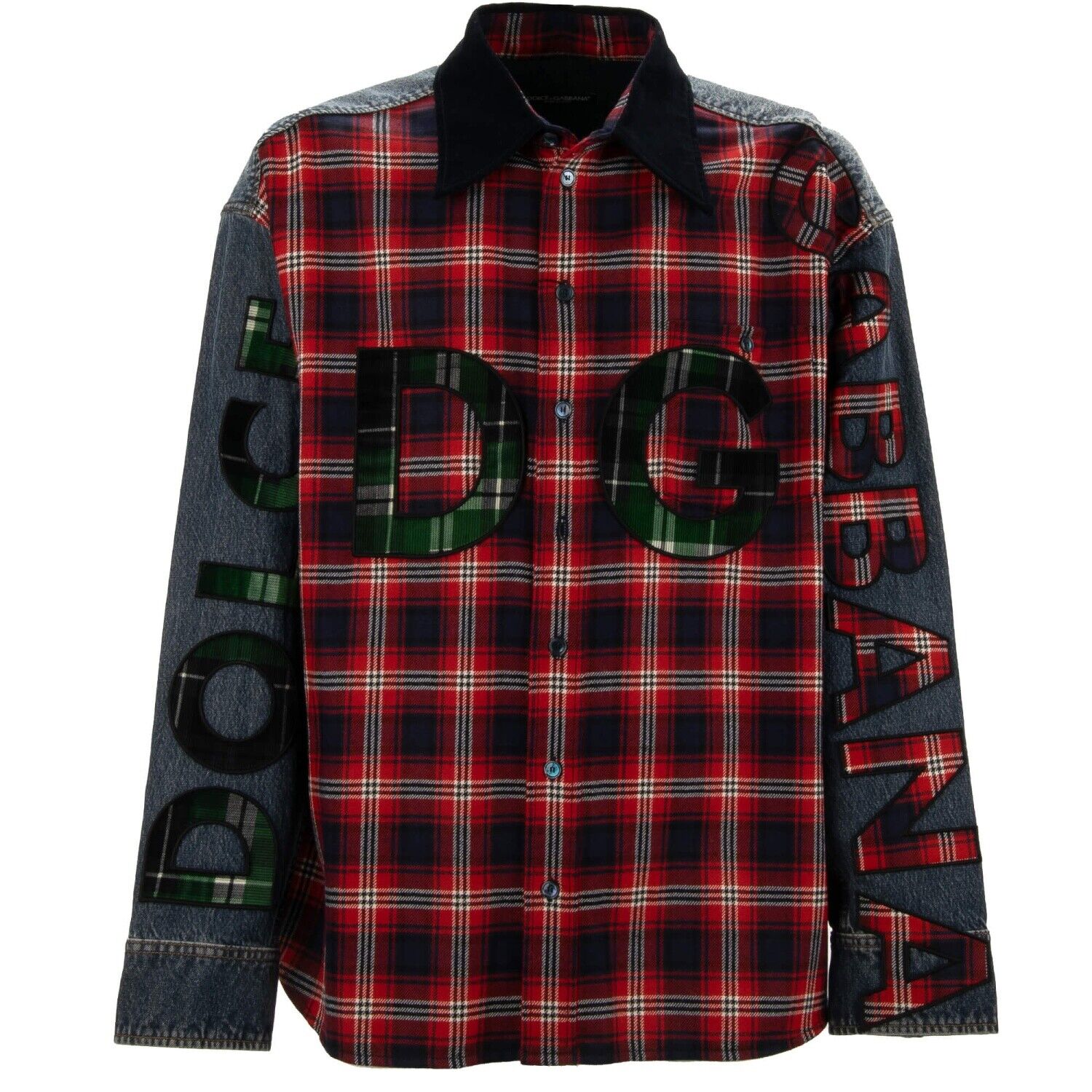 DOLCE & GABBANADG Logo Oversize Denim Checked Jeans Jacket Shirt Blue Red