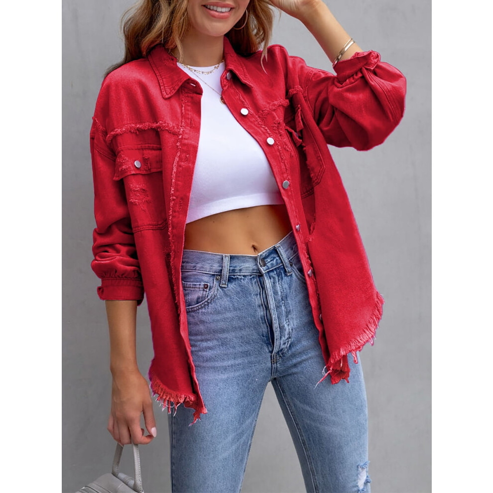 SEARIPE Women's Casual Denim Jacket Frayed Hem Ripped Long Sleeve Jean Jacket With Pockets Red S