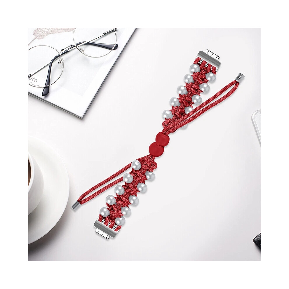 (Red, For Fitbit Inspire 3) For Fitbit Inspire 3/2/1 Women Pearl Nylon Braided Band Wristband Strap