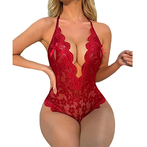 ROSVAJFY Women's Lace Bodysuit Sexy Lingerie One Piece Teddy Underwear Deep V Transparent Bodysuit Halter Leotard Naughty Sleepwear Backless Negligee for Valentine’s Day (Red)