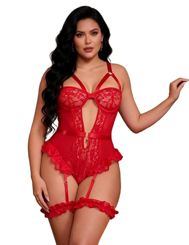 ohyeahlady Women Plus Size Lingerie Sets Sexy Mesh Lace Teddy Bodysuit with Garter Belt and Thigh Cuffs Red Size UK 16-18