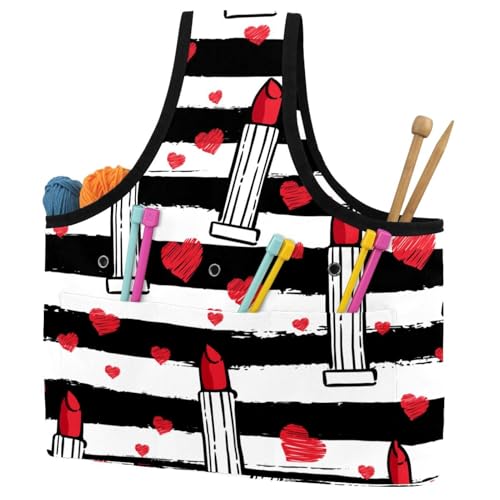 VAPOKF Yarn Storage Bag, Knitting Crochet Tote Bag, Yarn Holder with Pockets for Crocheting, Knitting Accessories (Lady Red Lipsticks Black White Stripes)