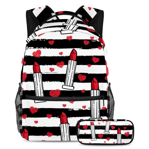 VAPOKF School Bag Set for Teen Girls Boys, Student Bookbag Backpack Rucksack with Pencil Case for School - Lady Red Lipsticks Black White Stripes