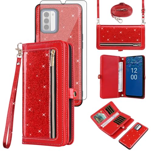 Asuwish Phone Case for Nokia G310/G42 5G Zipper Wallet Detachable Cell Cover with Tempered Glass Screen Protector Crossbody Lanyard Strap Bling Glitter Flip Card Holder NokiaG310 G 310 310G Women Red